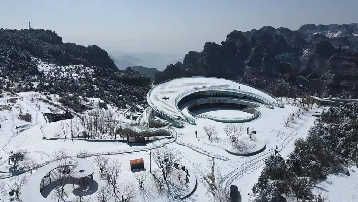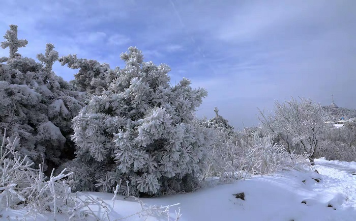 乘坐索道上王莽岭云顶,看日出云海雾凇,漫山遍野,悬崖边沟壑处,云雾缥渺似仙境。玉树琼枝的雾凇与云海相映,宛如仙境,美不胜收,令游客感叹陶醉。(摄影 张少毅)