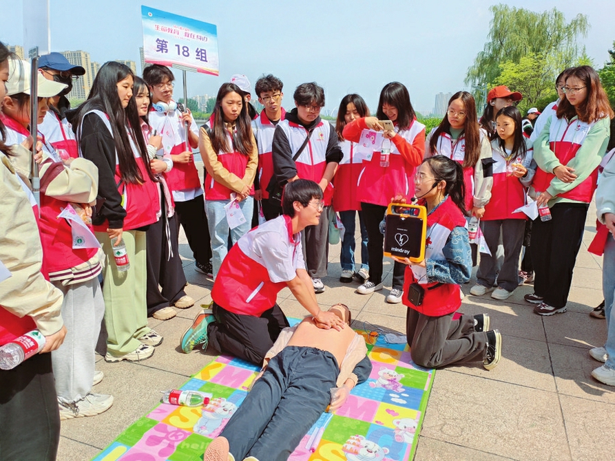 公共场所AED成为救命神器。红十字应急救护知识与AED技能培训深受大学生欢迎。 高凡摄