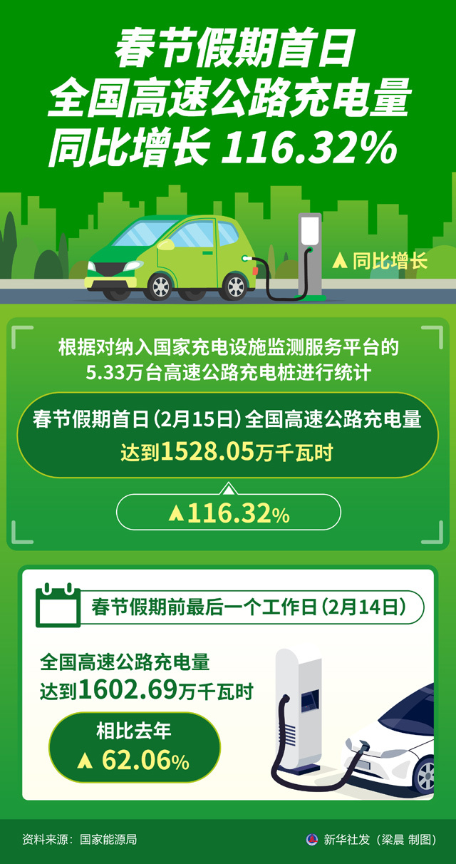 记者2月16日从国家能源局获悉,根据对纳入国家充电设施监测服务平台的5.33万台高速公路充电桩进行统计,春节假期首日(2月15日)全国高速公路充电量达到1528.05万千瓦时,同比增长116.32%。