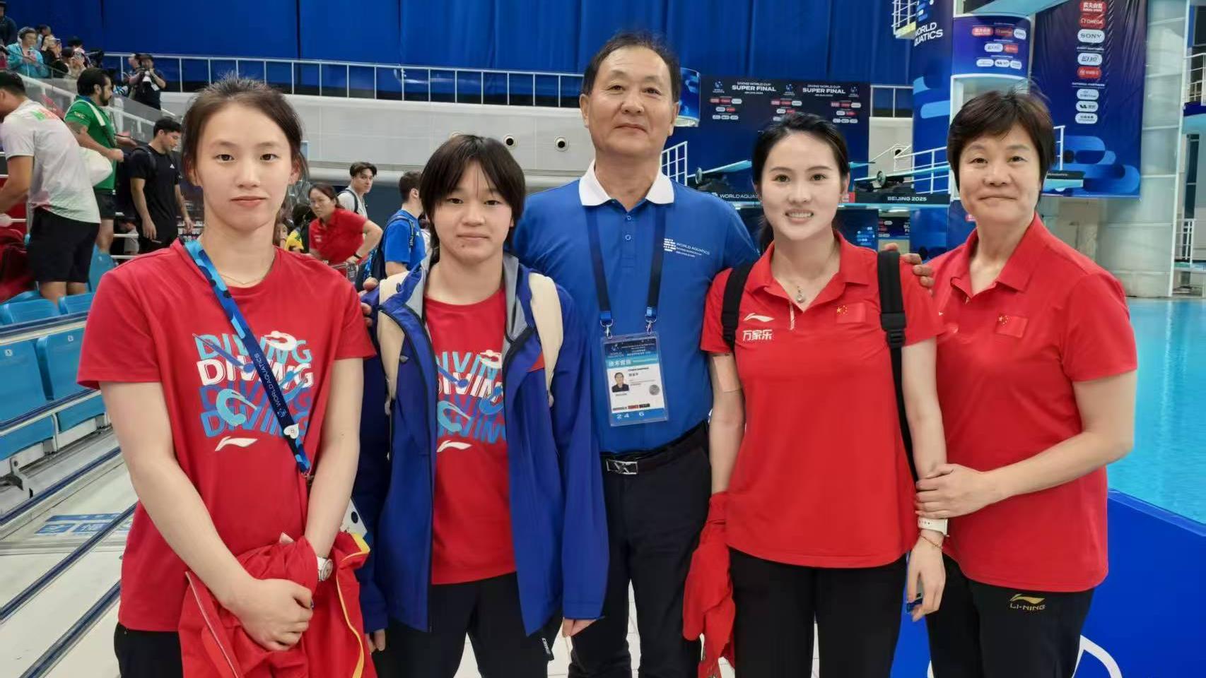 ▲陈安平担任2025年世界泳联跳水世界杯总决赛副总裁判长(左三)