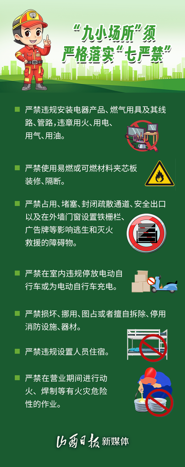 随着社会经济和城市的不断发展,“九小场所”数量不断增加,为大家的衣食住行提供了便利,但是这样的“小场所”可能暗藏着“大隐患”,你需要了解的消防安全知识来了。