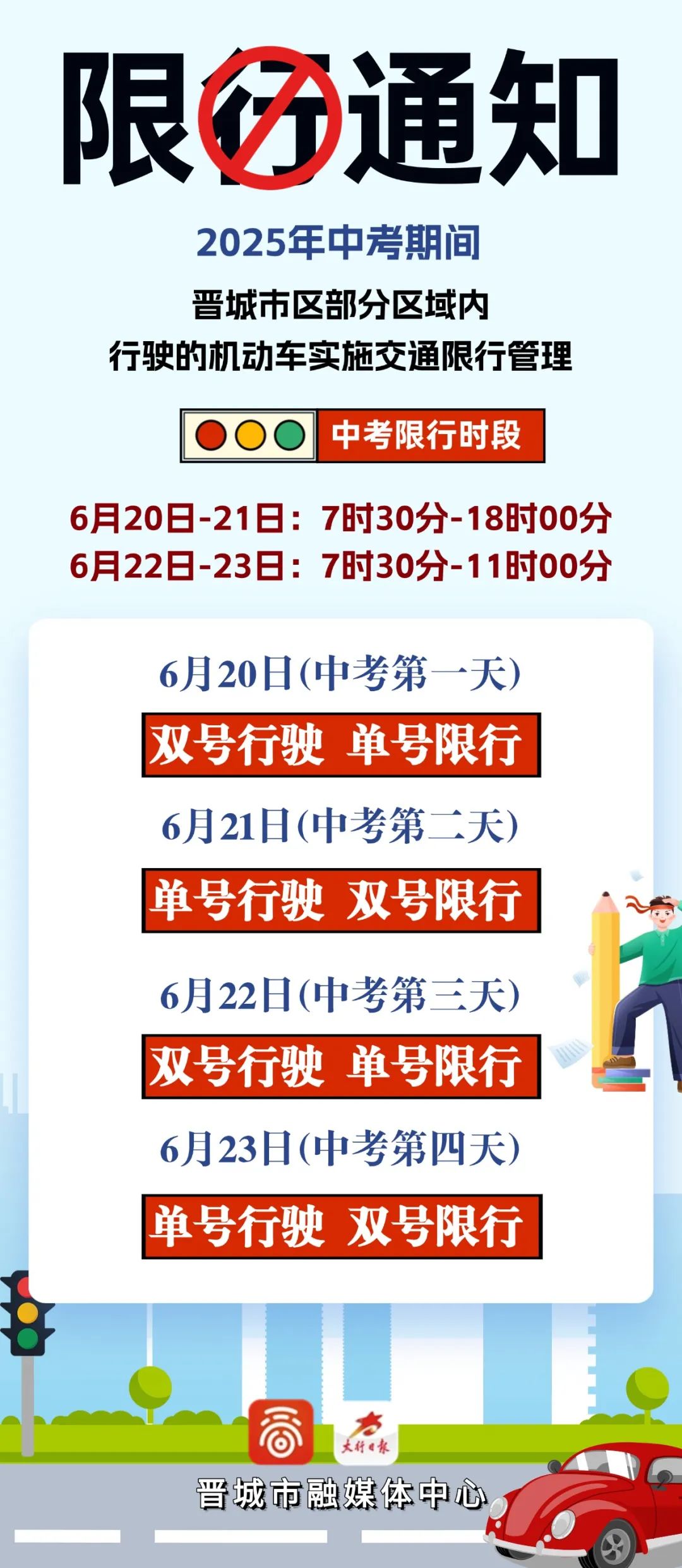 特别提醒:本次限行包含新能源汽车。根据晋城市公安局发布的《关于2025年高考、中考期间对市区部分区域实行机动车限行措施的通告》,进入限行区域道路行驶的所有机动车(含新能源汽车、外地号牌、临时号牌机动车)实施单号单日、双号双日行驶管理(尾号为英文字母的以最后一位数字为准)。