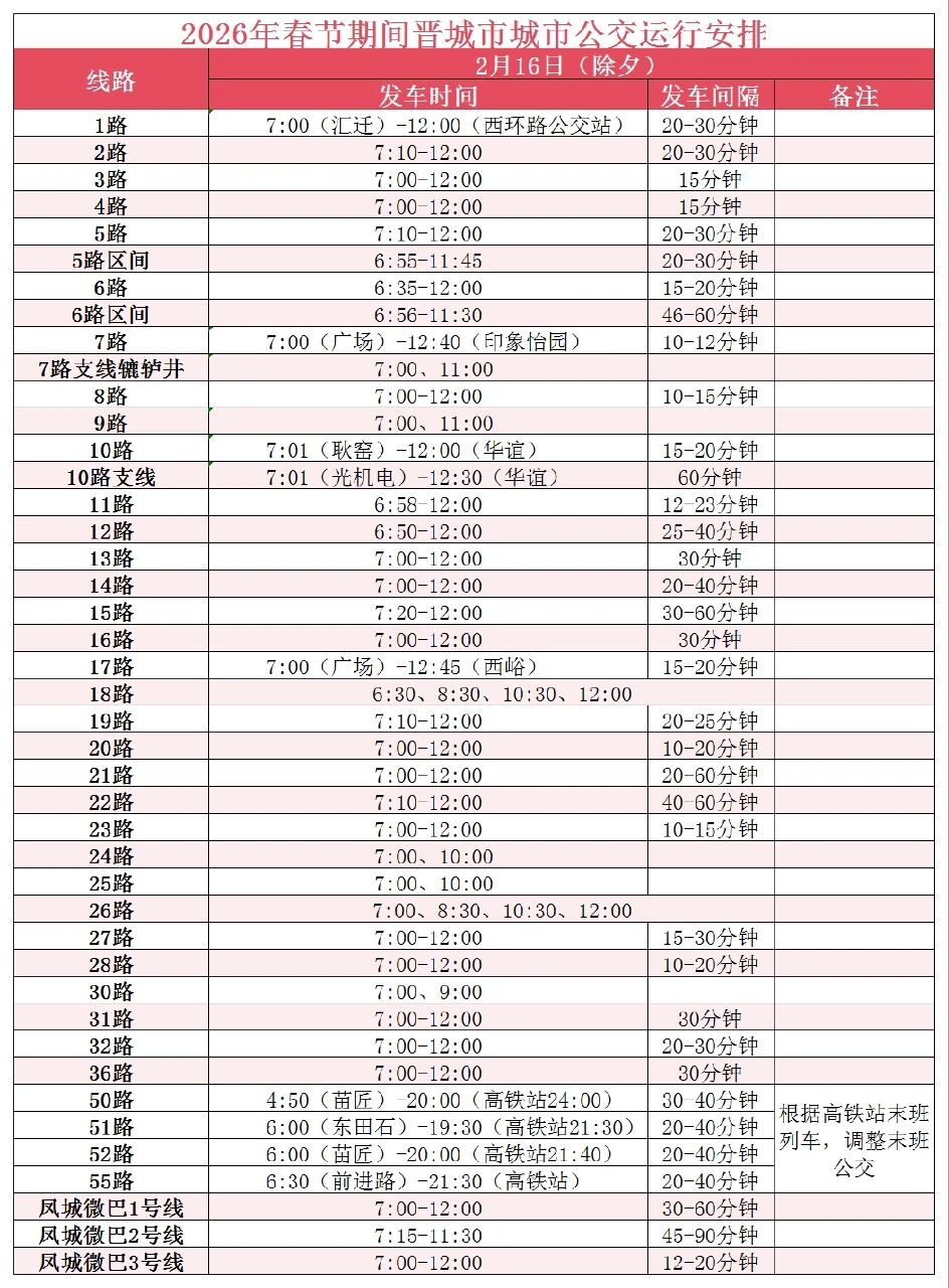 2026年2月15日(腊月廿八)到2月23日(正月初七)春节期间,晋城市公共交通有限公司所属城市、城际、城乡、镇村、旅游公交运行计划如下: