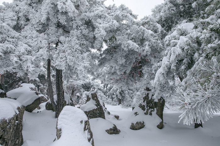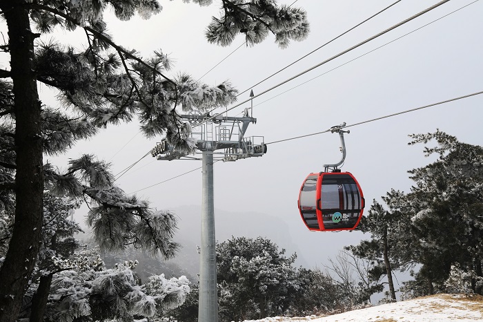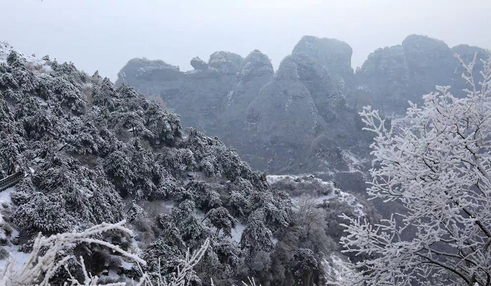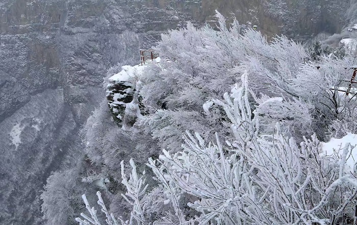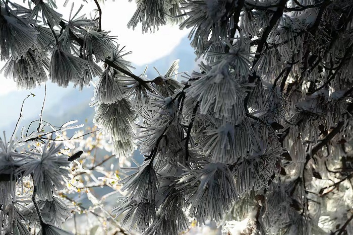 乘坐索道上王莽岭云顶,看日出云海雾凇,漫山遍野,悬崖边沟壑处,云雾缥渺似仙境。玉树琼枝的雾凇与云海相映,宛如仙境,美不胜收,令游客感叹陶醉。(摄影 张少毅)