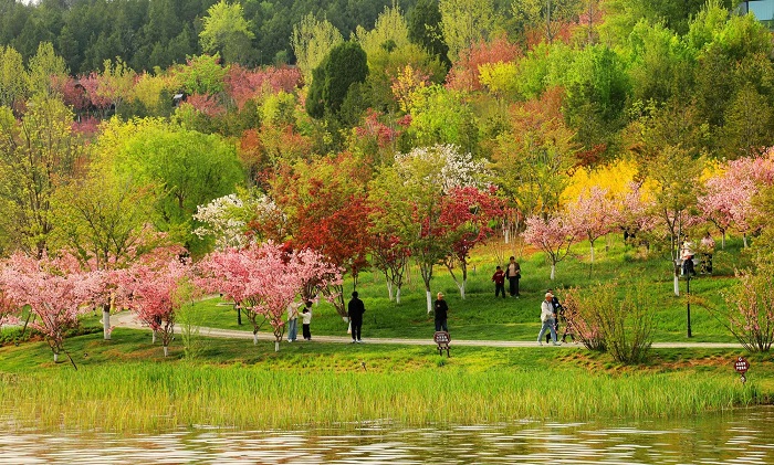 澄澈的湖水如碧玉般铺展,将岸边的桃红柳绿尽收其中。市民漫步其中,或拍照,或驻足赏景,与这自然景致融为一体;远处的城市楼宇在春色中若隐若现,与眼前的湖光山色形成奇妙的城景交融之态,尽显晋城“生态之城”的独特魅力。(张少毅 摄)