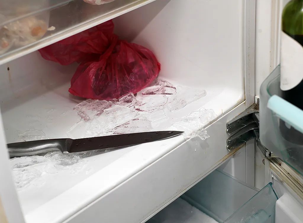 除冰时,尖锐的刀子极有可能划破冷冻室内壁。冰箱内部各种管道、线路错综复杂,划破内壁就有概率造成制冷剂泄漏。